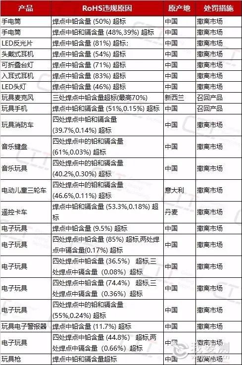 此次被通报产品主要集中在玩具、耳机和照明设备,其中玩具类产品占了68%,是RoHS违规产品的重灾区。产品焊点中铅含量超标为主要的违规原因,共有22款,其中有13款产品的镉含量也同时超标。