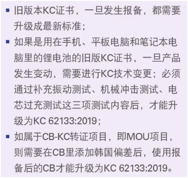 b、KC62133:2019版本的标准,将于2019年9月6日起正式实施。按法规要求,届时韩国认证机构(KTL、KTC、KTR等)只能签发KC 62133:2019版的KC证书,将不再接受2015、2018版的证书申请。