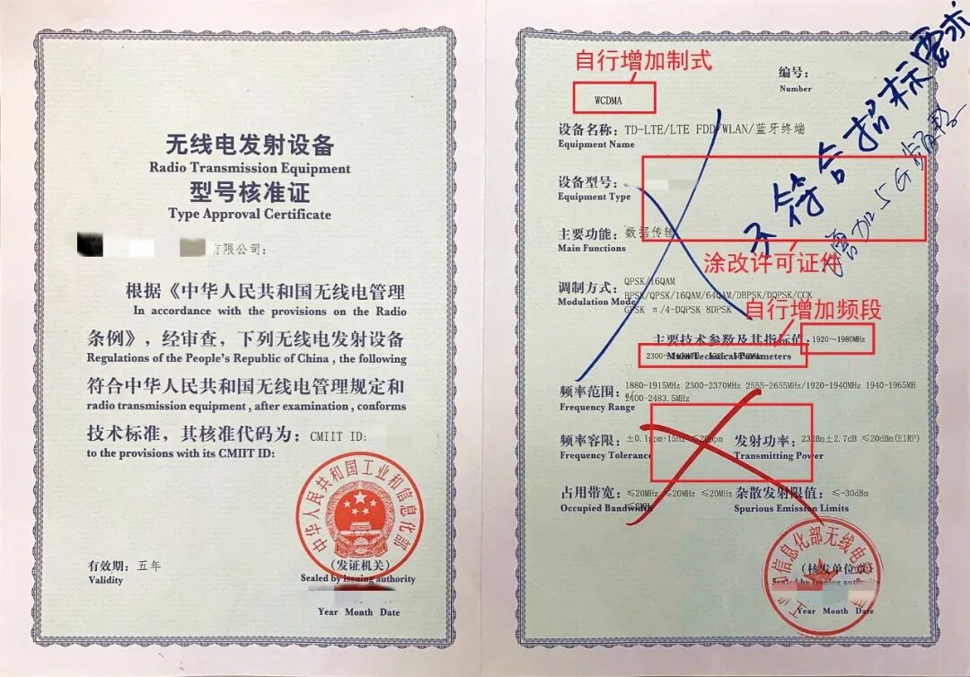 (三)涂改许可证件,自行涂写两个“×”、“不符合招标要求”、“增加5G频段”。